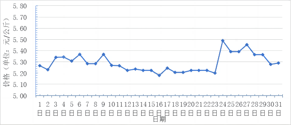 3月,全國(guó)重點(diǎn)監(jiān)測(cè)農(nóng)產(chǎn)品批發(fā)市場(chǎng)香蕉總交易量達(dá)2.7萬(wàn)噸,同比下降3.6%,環(huán)比增長(zhǎng)42.1%;總交易價(jià)值14303.7萬(wàn)元,同比下降27.7%,環(huán)比增長(zhǎng)43.48%。日平均價(jià)格最高為5.5元/千克,最低為5.2元/千克,全月平均價(jià)格為5.3元/千克,同比下降17.2%,環(huán)比基本持平(每日價(jià)格變化如圖)。