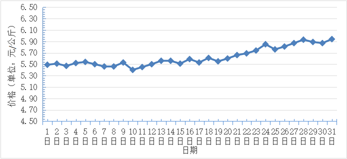 1月,全國香蕉日平均交易價格最高為5.9元/千克,最低為5.4元/千克,全月平均價格為5.6元/千克,同比上漲1.8%,環(huán)比上漲5.7%(每日價格變化如圖)。