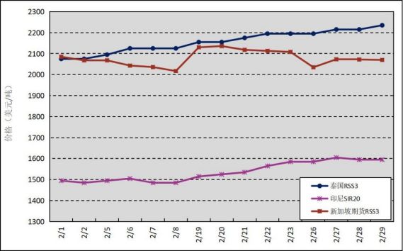 國外主產(chǎn)區(qū):2月,泰國RSS3平均價格為2157美元/噸,環(huán)比上漲272美元/噸,最高價為2235美元/噸,最低價為2075美元/噸;印尼SIR20平均價格為1537美元/噸,環(huán)比上漲32美元/噸,最高價為1605美元/噸,最低價為1485美元/噸;新加坡RSS3期貨主力合約月均結(jié)算價格為2078美元/噸,環(huán)比上漲208美元/噸,最高價為2136美元/噸,最低價為2017美元/噸。