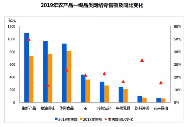 近日,在農(nóng)業(yè)農(nóng)村部市場與信息化司的指導(dǎo)與支持下,中國農(nóng)業(yè)科學(xué)院農(nóng)業(yè)信息研究所發(fā)布《中國農(nóng)產(chǎn)品網(wǎng)絡(luò)零售市場暨重點單品分析報告》(以下簡稱《報告》)。報告針對全國農(nóng)產(chǎn)品網(wǎng)絡(luò)零售市場進行分析,其中2019年生鮮產(chǎn)品網(wǎng)絡(luò)零售額突破1094.9億元,成為農(nóng)產(chǎn)品上行第一大品類,網(wǎng)絡(luò)零售量同比增加78.4%。