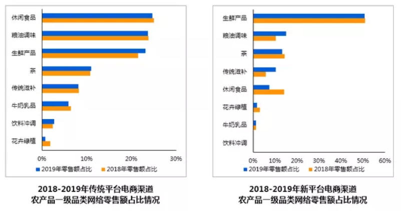 《報告》分析,傳統(tǒng)電商平臺中,農(nóng)產(chǎn)品網(wǎng)絡(luò)銷售前三大品類依次為休閑食品、糧油調(diào)味、生鮮產(chǎn)品,占比分別為25%、23.8%、21.5%。但以拼多多為代表的新電商平臺以及新零售渠道中,生鮮產(chǎn)品的網(wǎng)絡(luò)零售額占比均超過50%,而傳統(tǒng)電商平臺生鮮產(chǎn)品零售額占比不足25%。