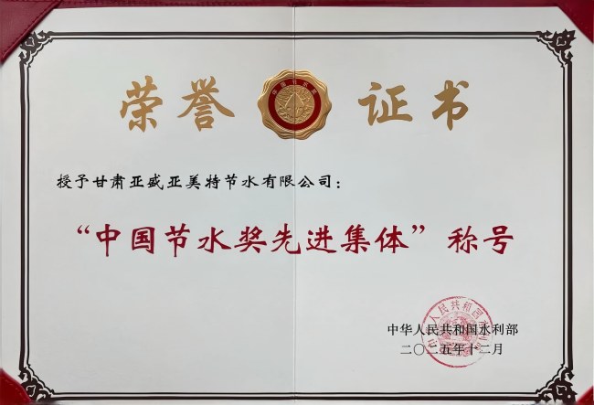 12月26日,首屆中國節(jié)水獎(jiǎng)?lì)C獎(jiǎng)會在北京召開,亞盛亞美特公司榮獲“中國節(jié)水獎(jiǎng)先進(jìn)集體”稱號。該獎(jiǎng)項(xiàng)是經(jīng)黨和國家功勛榮譽(yù)表彰工作委員會批準(zhǔn)設(shè)立、由水利部主辦的節(jié)水領(lǐng)域最高獎(jiǎng)項(xiàng)。