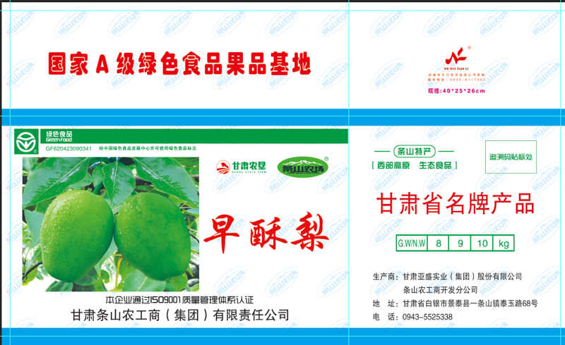 條山農(nóng)場從1993年開始實施綠色食品的生產(chǎn)與認(rèn)證的基礎(chǔ)性工作,先后有啤酒大麥、啤酒花、大接杏、早酥梨、黃金梨、黃冠梨、紅富士蘋果、馬鈴薯、洋蔥、枸杞、杏醬、番茄醬等12個產(chǎn)品被中國綠色食品發(fā)展中心認(rèn)定為綠色食品;林果基地被認(rèn)定為國家A級綠色食品果品生產(chǎn)基地,被國家標(biāo)準(zhǔn)化管理委員會批準(zhǔn)為國家級農(nóng)業(yè)標(biāo)準(zhǔn)化早酥梨種植示范區(qū)。隨著產(chǎn)業(yè)結(jié)構(gòu)調(diào)整,目前已成規(guī)模化、產(chǎn)業(yè)化發(fā)展的綠色食品有“條山牌”早酥梨、黃冠梨、大接杏、紅富士蘋果、加工型馬鈴薯5個產(chǎn)品;早酥梨、黃冠梨通過有機食品認(rèn)證;馬鈴薯、果品通過了出口產(chǎn)品基地備案認(rèn)證,果品包裝獲得出口注冊登記;條山梨被認(rèn)定為國家地理標(biāo)志產(chǎn)品;條山牌榮獲“2015中國十大梨品牌”和“2015中國果品百強品牌”稱號;早酥梨蟬聯(lián)中國綠色食品博覽會金獎、榮獲2017甘肅農(nóng)業(yè)博覽會金獎;黃冠梨、早酥梨榮獲2017年甘肅名牌產(chǎn)品稱號;“條山”牌早酥梨入選“甘味”農(nóng)產(chǎn)品企業(yè)商標(biāo)品牌名錄。建成了高標(biāo)準(zhǔn)的綠色食品果品基地1萬畝(有機果品1061.1畝)、馬鈴薯基地場內(nèi)場外各1萬畝,輻射帶動周邊市縣發(fā)展林果業(yè)30萬畝。