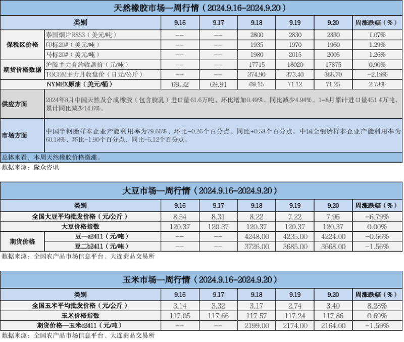 天然橡膠、大豆、玉米市場(chǎng)一周行情(2024.09.16-09.20)