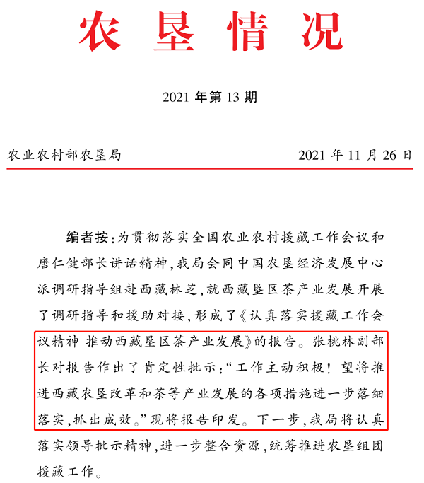 4.2021年10月,為貫徹落實全國農(nóng)業(yè)農(nóng)村援藏工作會議精神,經(jīng)濟貿(mào)易處牽頭組織調(diào)研組赴西藏開展專題調(diào)研。通過實地考察林芝市易貢茶場、察隅農(nóng)場等茶業(yè)種植區(qū),形成《認(rèn)真落實援藏工作會議精神 推動西藏墾區(qū)茶產(chǎn)業(yè)發(fā)展》調(diào)研報告,獲得張?zhí)伊指辈块L肯定性批示。