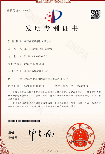 5. 2021年6月,信息服務(wù)處成功申請《標(biāo)準(zhǔn)閾值數(shù)字化轉(zhuǎn)譯方法》專利技術(shù),創(chuàng)造性地將產(chǎn)地環(huán)境標(biāo)準(zhǔn)、生產(chǎn)標(biāo)準(zhǔn)、產(chǎn)品標(biāo)準(zhǔn)等進行數(shù)字化轉(zhuǎn)譯,將書面標(biāo)準(zhǔn)轉(zhuǎn)化為信息系統(tǒng)可識別的數(shù)字標(biāo)準(zhǔn),從而實現(xiàn)精準(zhǔn)質(zhì)量控制。目前已在多家農(nóng)墾企業(yè)的全面質(zhì)量管理數(shù)字化項目中應(yīng)用,涵蓋種植業(yè)、畜牧業(yè)、漁業(yè)等產(chǎn)業(yè),在推動企業(yè)智能化質(zhì)量安全監(jiān)管、提升產(chǎn)品質(zhì)量等方面發(fā)揮了巨大作用。