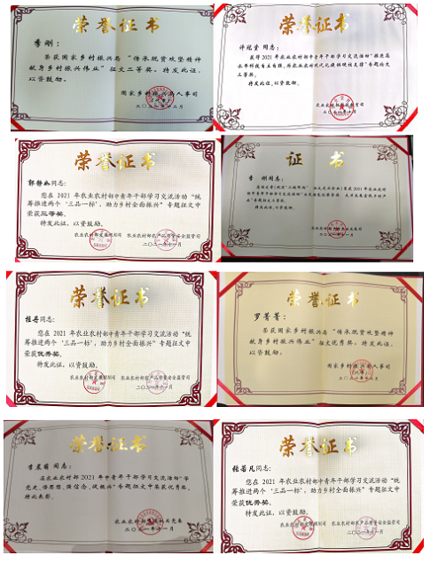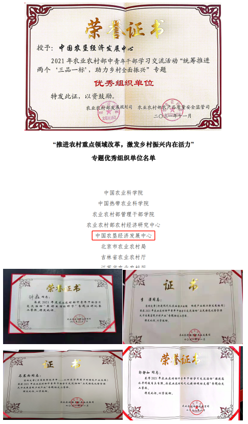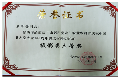 10. 在2021年農(nóng)業(yè)農(nóng)村部中青年干部交流論壇中,中國農(nóng)墾經(jīng)濟發(fā)展中心分獲專題二及專題三優(yōu)秀組織單位;青年同志累計投稿27篇,獲獎16項,其中,鐘鑫、桂丹、李瀟、馬晨雨、郭靜如、季剛獲得二等獎;許冠堂、郭靜如、季剛獲得三等獎;桂丹、羅菁菁、李晨萌、張若凡獲得優(yōu)秀獎;鐘鑫還獲得專題七演講比賽二等獎。在“永遠(yuǎn)跟黨走”農(nóng)業(yè)農(nóng)村部慶祝中國共產(chǎn)黨成立100周年職工書畫攝影展中,羅菁菁同志獲得“攝影類三等獎”。