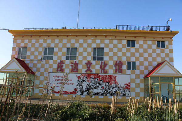 一八六團戍邊文化館位于一八六團六連連部,緊鄰諾亞堡民兵哨所,離一八六團團部五公里,戍邊文化館為框架結(jié)構(gòu)、局部三層、高度為9米,建筑面積為400平方米。2011年開始建設(shè),2014年5月6日裝修布展工程全面竣工,展廳面積280平方米,陳展實物50件,年均接待2000人次。2017年史館被授予“兵團廉政教育基地”,2018年被授予“十師民族團結(jié)進步教育基地”。