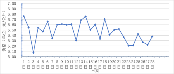 2月,全國(guó)重點(diǎn)監(jiān)測(cè)農(nóng)產(chǎn)品批發(fā)市場(chǎng)香蕉總交易量達(dá)2.4萬噸,同比下降63.1%,環(huán)比下降75.8%;總交易價(jià)值16338.5萬元,同比下降49.5%,環(huán)比下降72.0%。日平均價(jià)格最高為6.8元/千克,最低為6.1元/千克,全月平均價(jià)格為6.5元/千克,同比上漲22.1%,環(huán)比上漲22.1%(每日價(jià)格變化如圖)。
