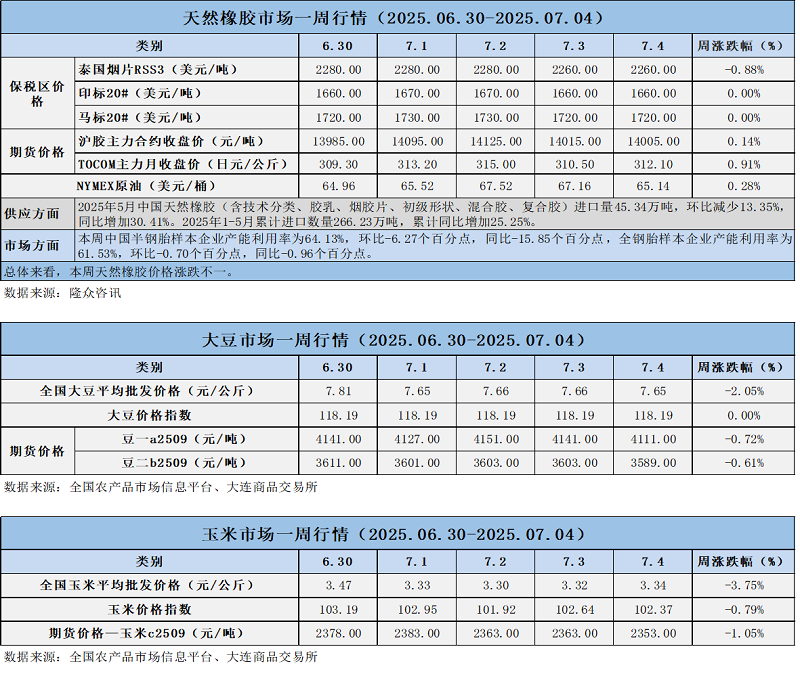 天然橡膠、大豆、玉米市場(chǎng)一周行情(2025.06.30-07.04)
