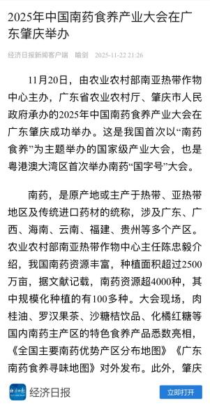 農(nóng)墾中心主辦,廣東省農(nóng)業(yè)農(nóng)村廳、肇慶市人民政府承辦的2025年中國南藥食養(yǎng)產(chǎn)業(yè)大會在廣東肇慶成功舉辦,工作報(bào)告獲分管部領(lǐng)導(dǎo)肯定性批示,經(jīng)濟(jì)日報(bào)等媒體報(bào)道大會情況。