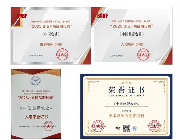 兩刊編輯出版工作取得新成績?!吨袊r(nóng)墾》獲“2025BIBF精品期刊展”推薦期刊證書;《中國熱帶農(nóng)業(yè)》獲“2025BIBF精品期刊展”入展期刊證書、“2025北方精品期刊展”入展榮譽(yù)證書,并被維普評為2025年度學(xué)術(shù)影響力進(jìn)步期刊。
