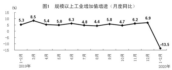 1-2月份,規(guī)模以上工業(yè)增加值同比下降13.5%。分經(jīng)濟(jì)類型看,國有控股企業(yè)增加值下降7.9%;股份制企業(yè)下降14.2%,外商及港澳臺商投資企業(yè)下降21.4%;私營企業(yè)下降20.2%。分三大門類看,采礦業(yè)增加值下降6.5%,制造業(yè)下降15.7%,電力、熱力、燃?xì)饧八a(chǎn)和供應(yīng)業(yè)下降7.1%。從產(chǎn)品產(chǎn)量看,醫(yī)療防護(hù)和生活所需物資增長較快,口罩、發(fā)酵酒精產(chǎn)量分別增長127.5%和15.6%,凍肉和方便面分別增長13.5%和11.4%。高技術(shù)產(chǎn)品增勢良好,智能手表、智能手環(huán)、半導(dǎo)體分立器件和集成電路產(chǎn)量分別增長119.7%、45.1%、31.4%和8.5%?;驹牧仙a(chǎn)平穩(wěn),生鐵、粗鋼、平板玻璃、十種有色金屬產(chǎn)量分別增長3.1%、3.1%、2.3%和2.2%。全國采購經(jīng)理調(diào)查數(shù)據(jù)結(jié)果顯示,截至2月25日,大中型制造業(yè)企業(yè)復(fù)工率達(dá)到85.6%,生產(chǎn)經(jīng)營活動正有序恢復(fù)。