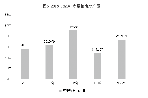 糧食總產(chǎn)量3562.74萬噸,比上年增加121.67萬噸,增長3.5%(見圖3)。主要農(nóng)產(chǎn)品產(chǎn)量見表1。