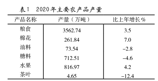 表1 2020年主要農(nóng)產(chǎn)品產(chǎn)量
