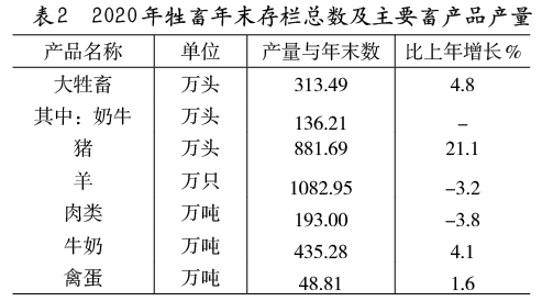 表2 2020年牲畜年末存欄總數(shù)及主要畜產(chǎn)品產(chǎn)量